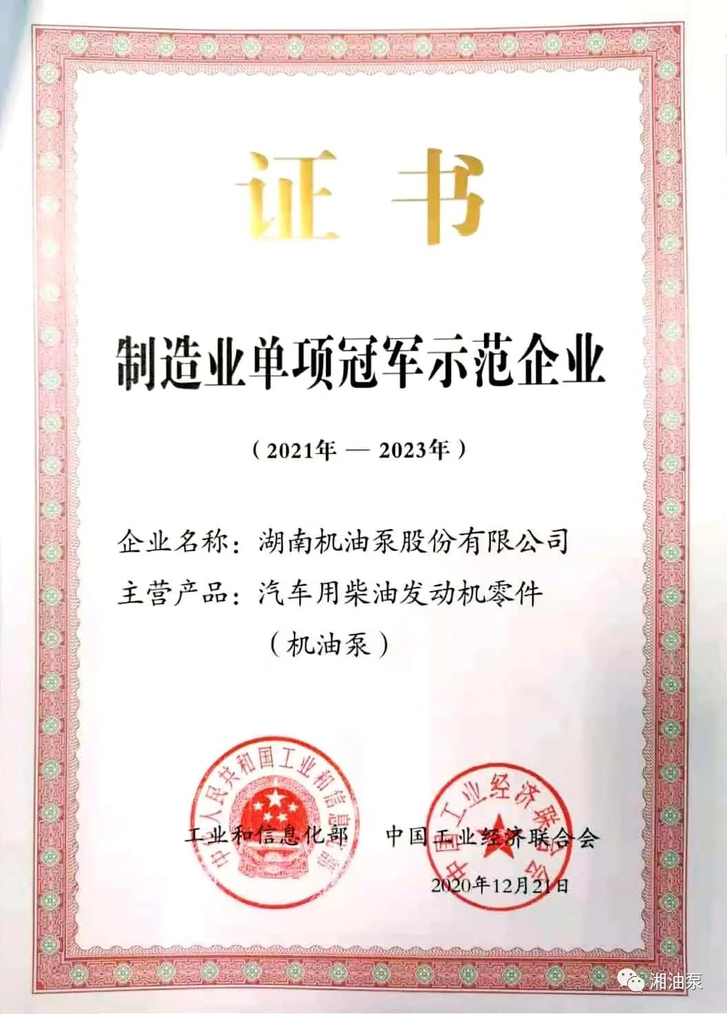 湖南機油泵股份有限公司被授予制造業單項冠軍示范企業